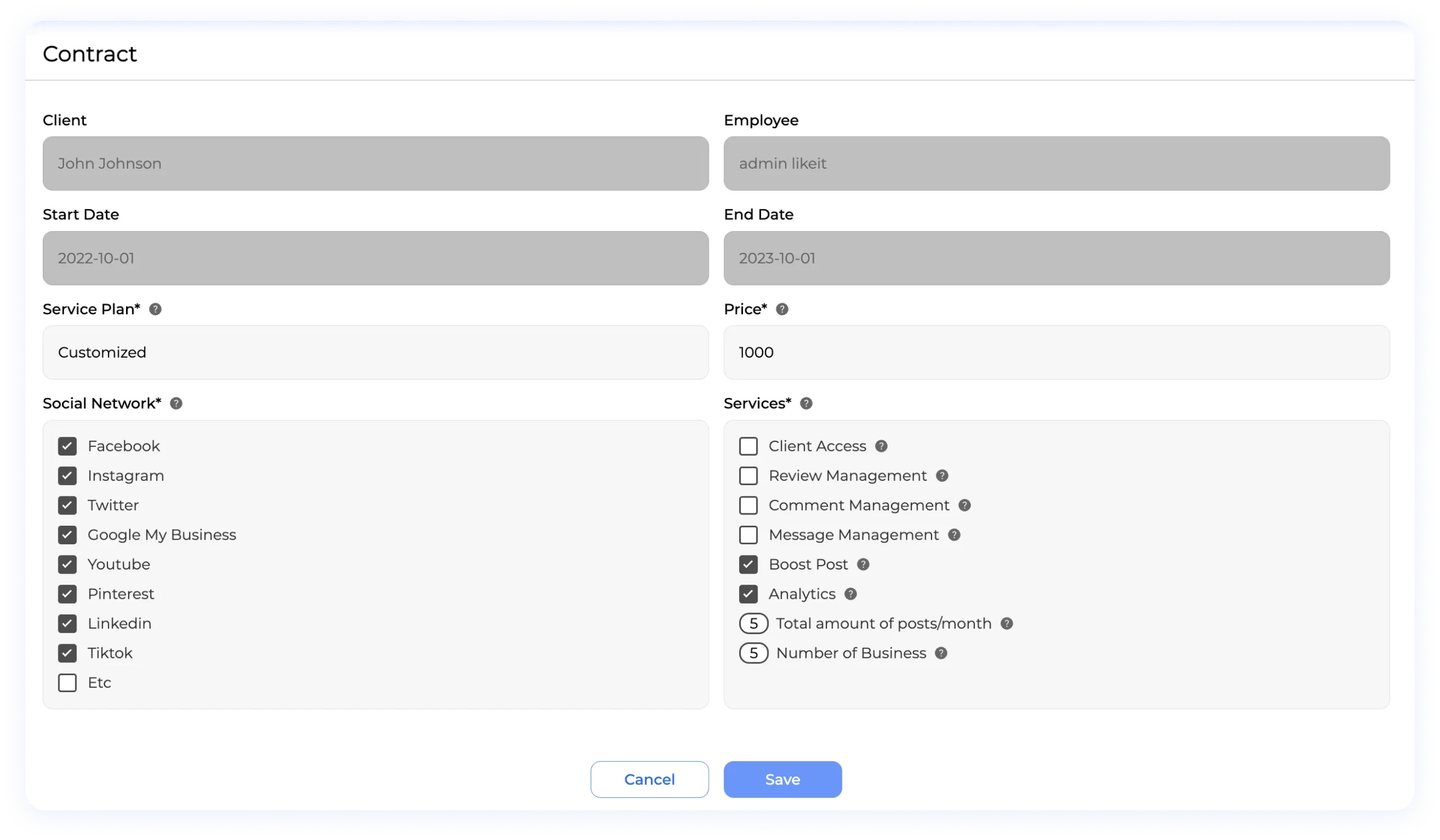 Finally once you are in here you can modify details such as the plan and view the contract’s history, including services, social media accounts and previous activity related to the plan modification, please always bear in mind that this contract will be used for creating the benchmarks in the report section and in the dashboard to control response rates and post completion.