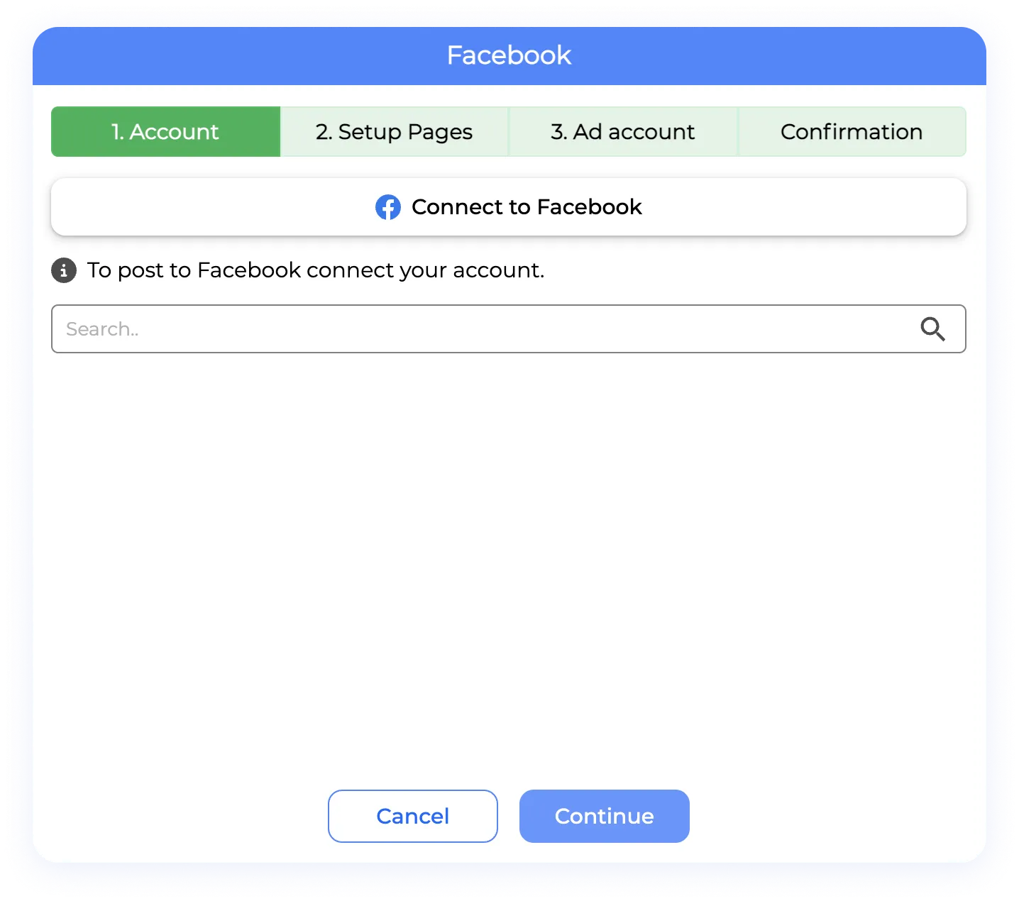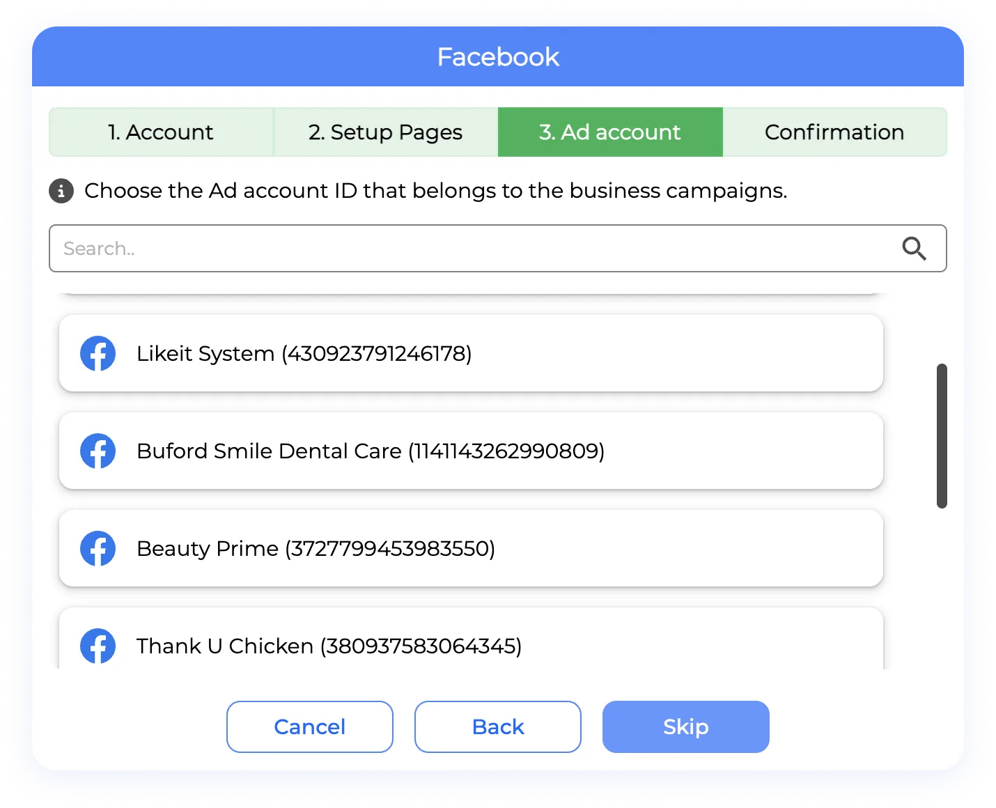 Section 3. Ad account: On the third step and only in Facebook, you can add your ad account for launching boost post using our tool, select the correct ad account for each social media you connect, also please bear in mind that this step is completely optional, you either can click “Skip” or “Continue” depending on what you wish.