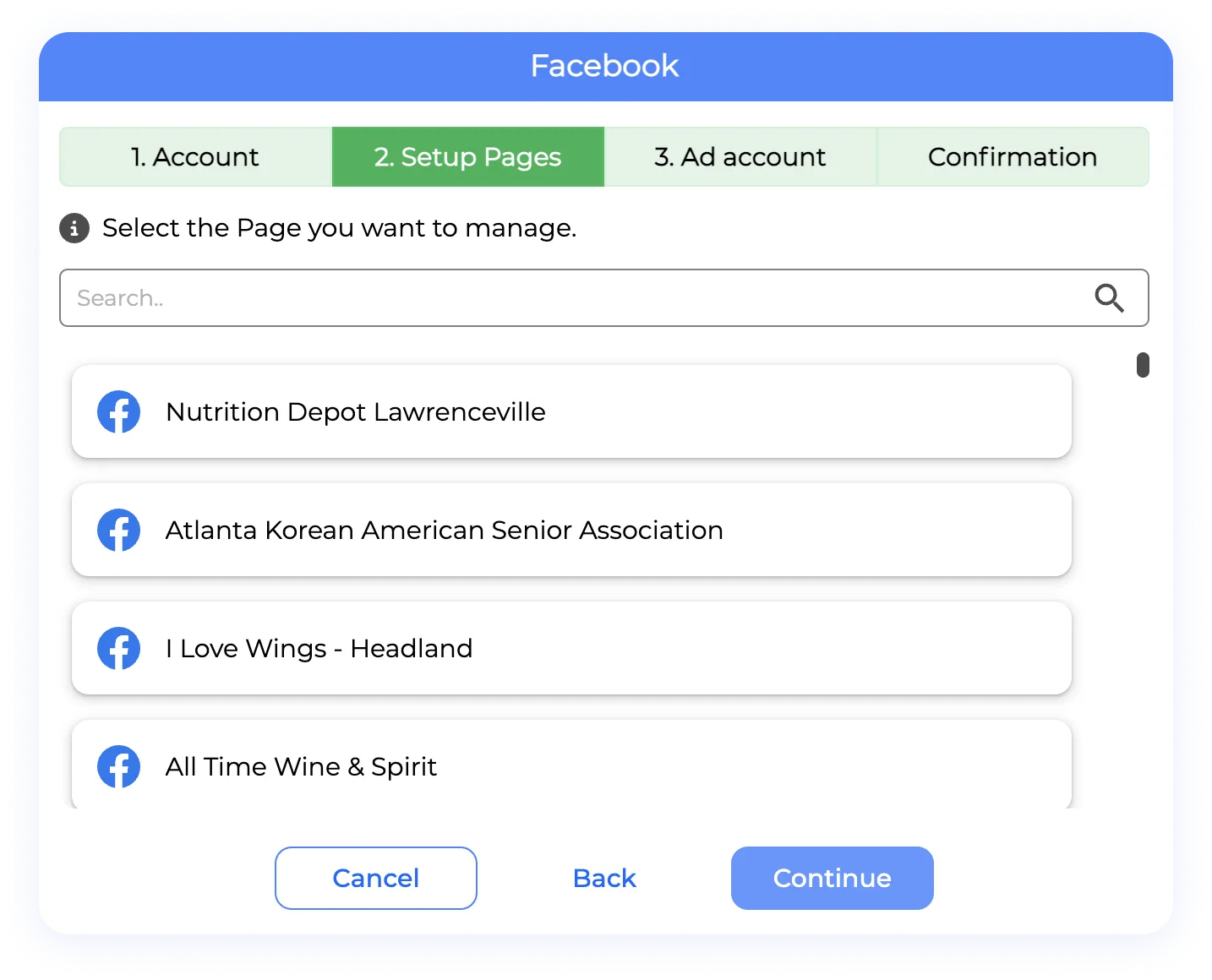Section 2. Set up page: The list of businesses you granted access to will appear, depending on the social media this section will be available or not, allowing you to connect the corresponding account to the business you are linking. Select the correct page and click “Continue”