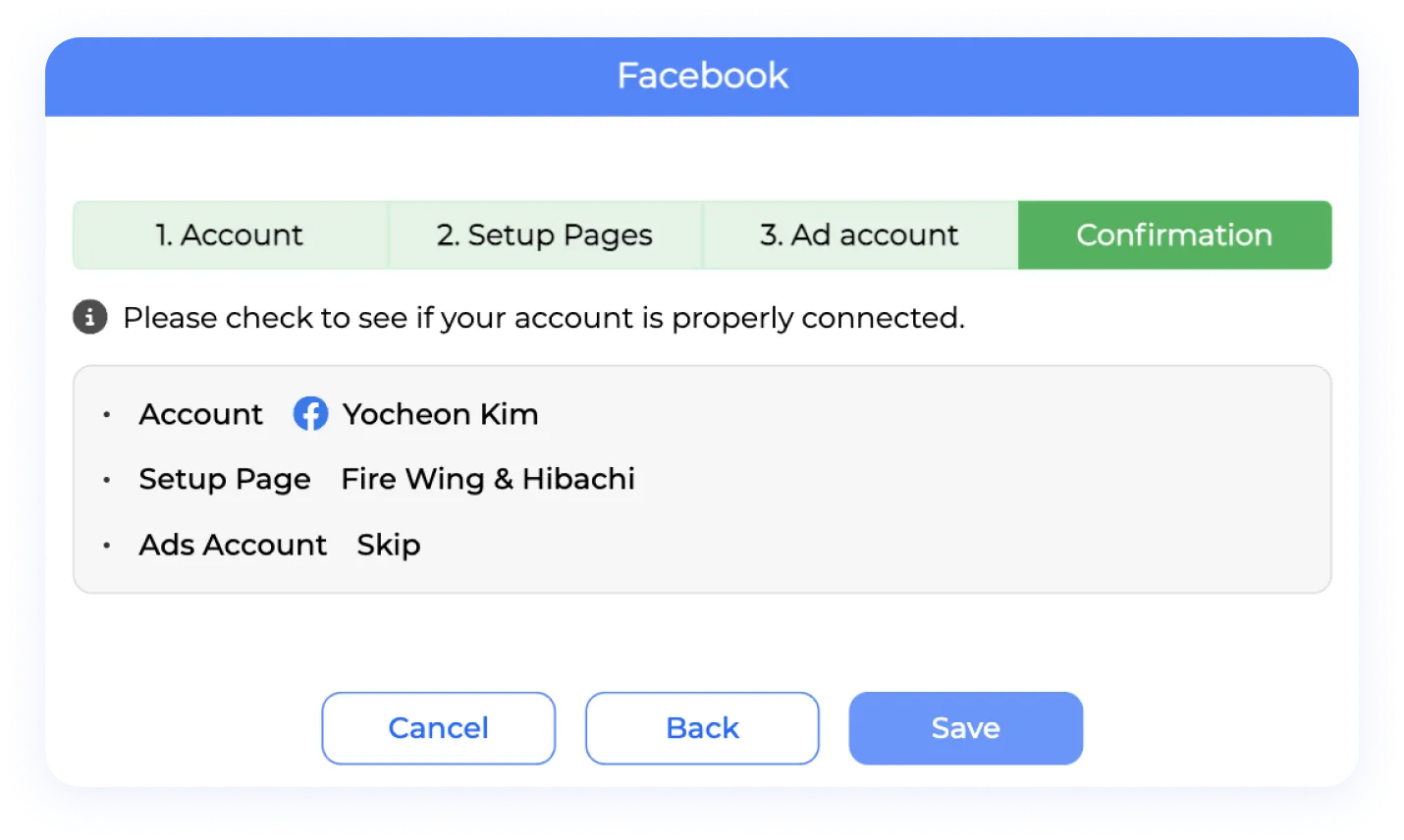 Section 4. Confirmation: On the final page, confirm that the connection is correct by checking both your Facebook account and the selected business page. Click “Save” to establish the connection.
