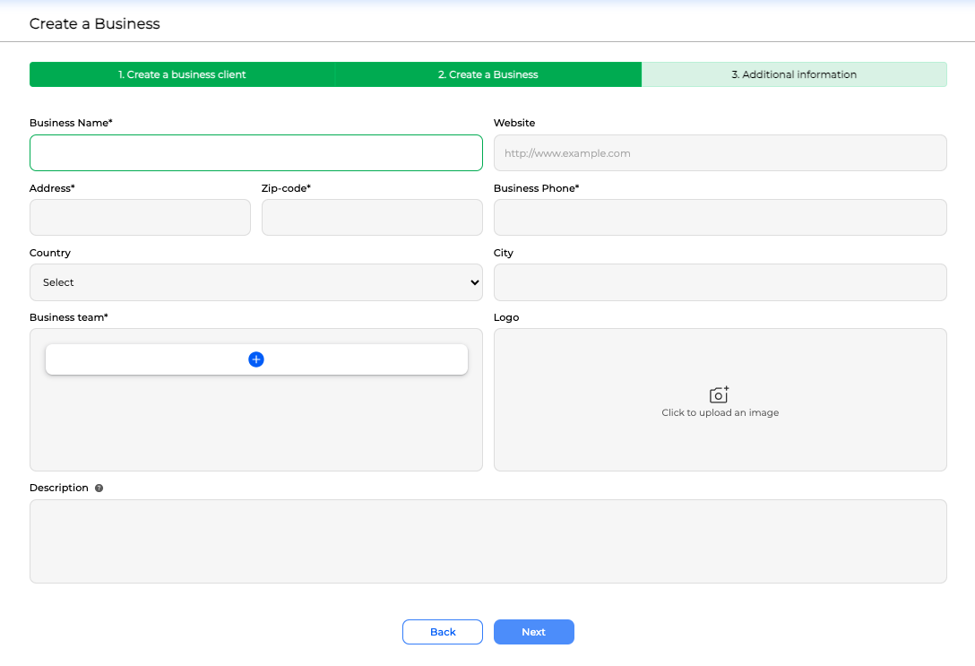 In the business information tab, the user can input the mandatory information: business name, address, zip code, business phone, and the optional information of: Website, country, state, city, logo, and description. All this information may be modifiable later.