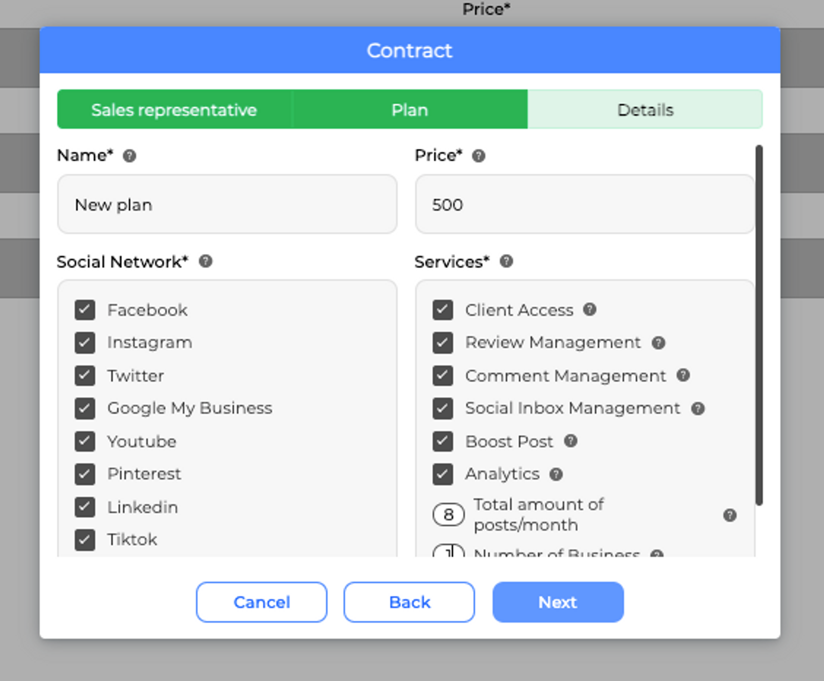Also, the plan selected for the business will define the social networks to be managed, the services to be included, and the price per month, so it’s important to select or create the appropriate plan for the business.