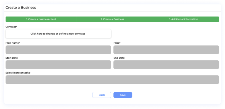 The first section is the client contact section, here the user has to select or create a new client. If you need to create a new client, please follow the link “ Clients And How To Create New Ones?“. After selecting a client to be linked, click next and go to the business information tab.
