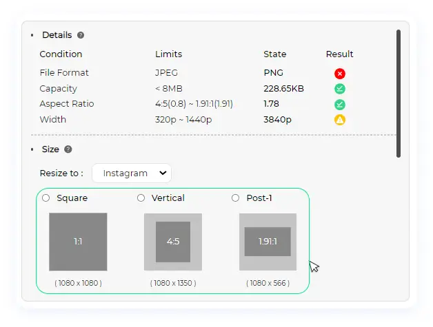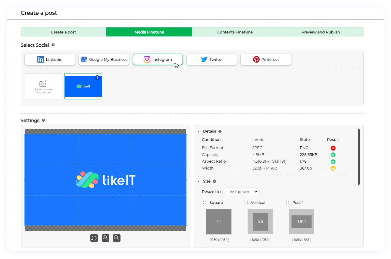 Step 3.5 Our system curates the file types and ensures that the allowed formats for each social media platform are respected. If you add an image that doesn’t meet the social media requirements, we’ll let you know.